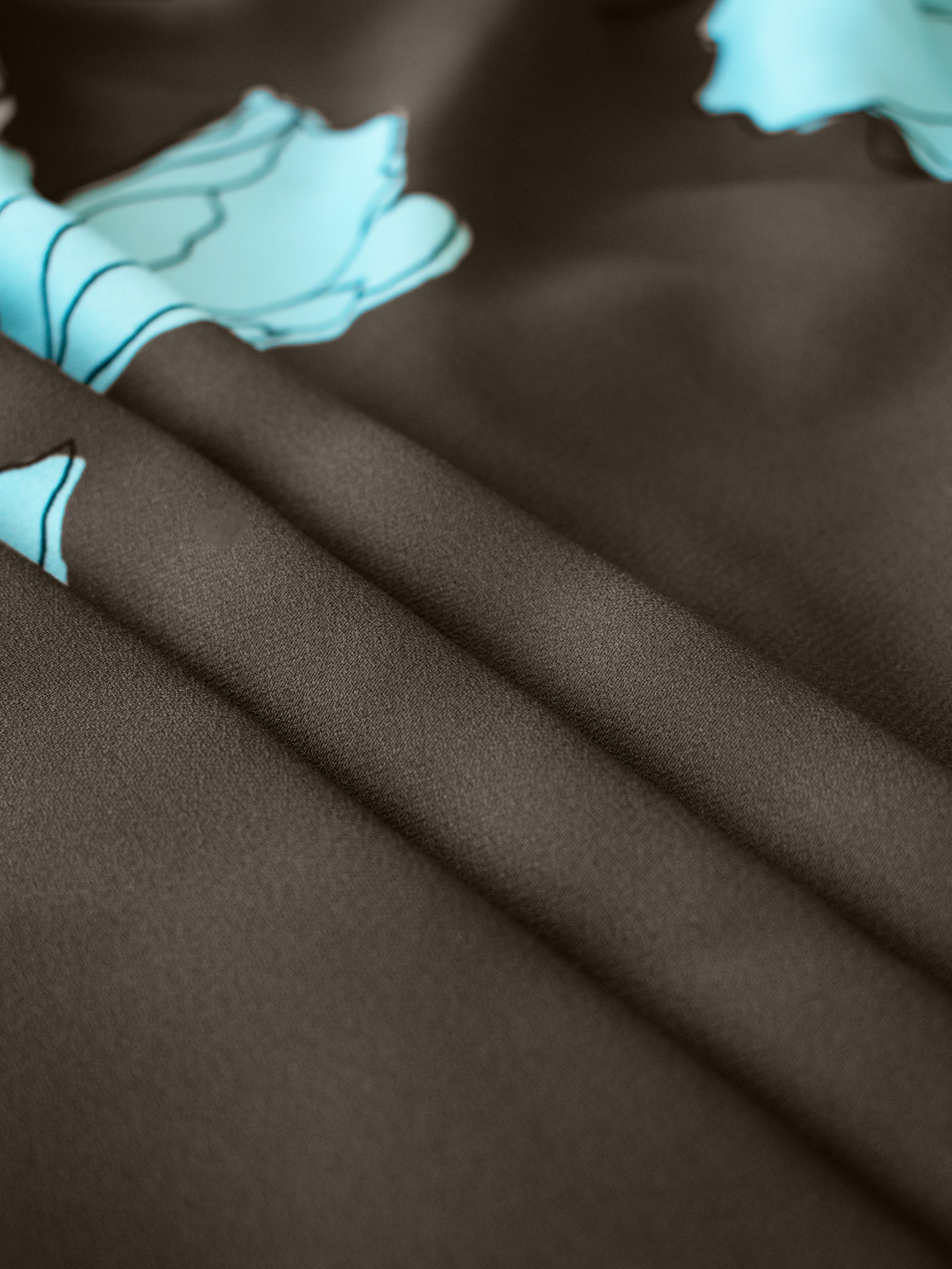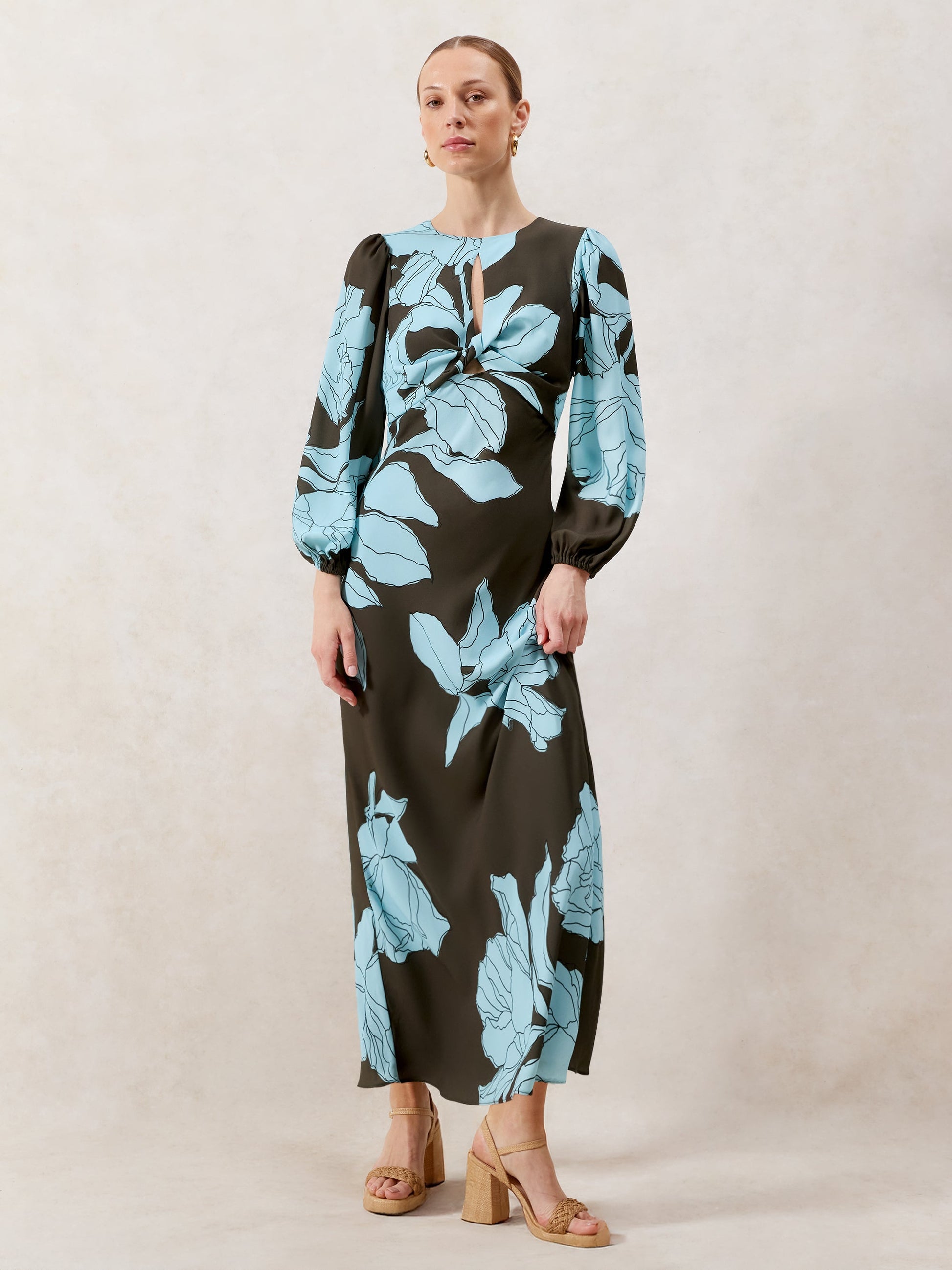Event dressing is easy with Mae as your plus-one. In a striking palette of khaki and turquoise, this long-sleeved, crepe midi dress is splashed with a supersized floral print. A cut-out at the bodice lends a sultry touch, while a subtle twist perfectly conceals a bra. We also love the blouson sleeves and flattering bias-cut skirt.