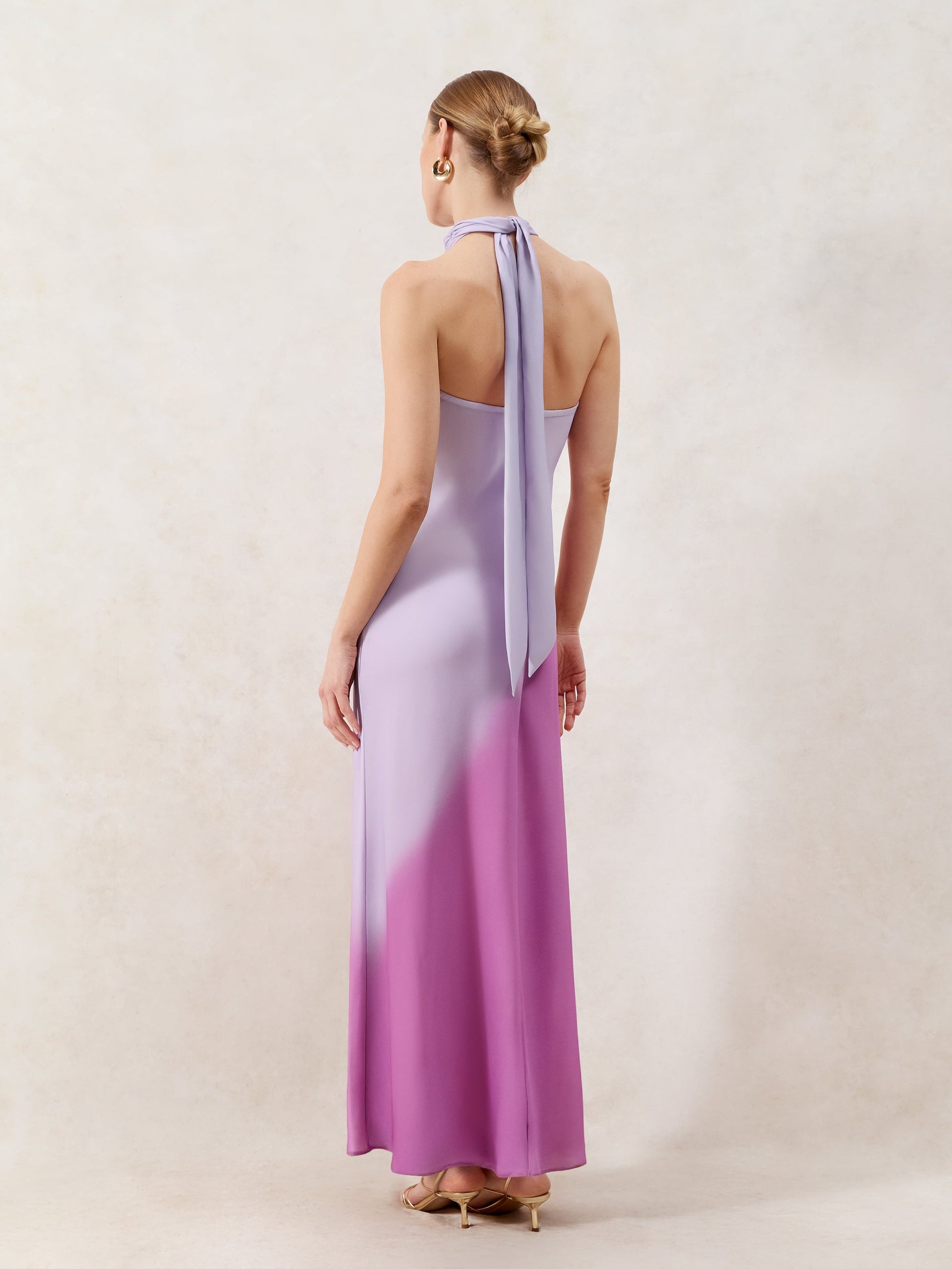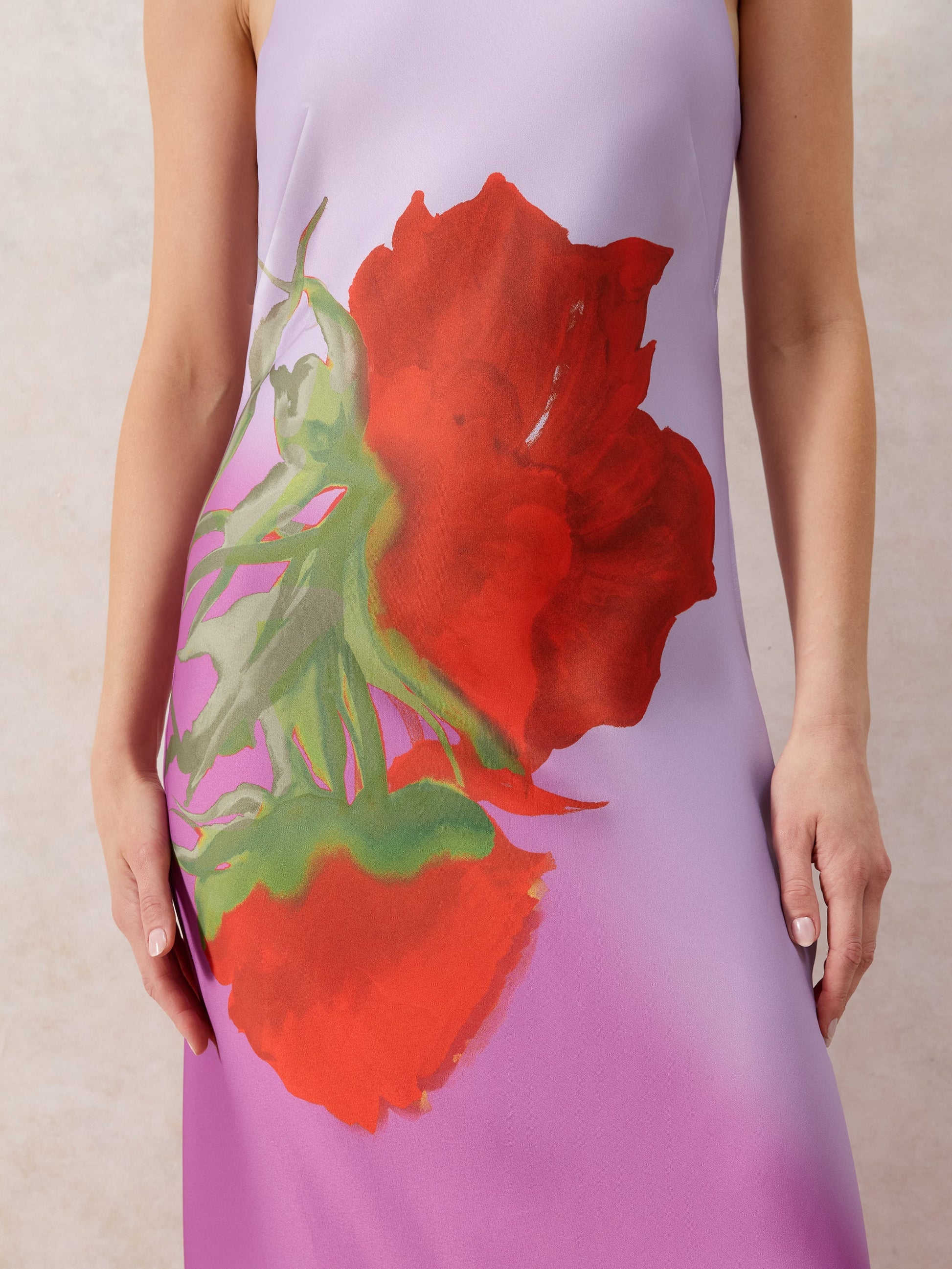 Margot is unforgettable. This super-chic, halter-neck maxi dress is bias-cut from glossy, ombr¨¦ satin ¨C fully lined for opacity ¨C and splashed with a supersized floral motif. Loop the neck-tie into a bow at your nape, sweeping hair up to show off the sultry open back. Finish the look with a pair of sandals in the same scarlet shade as Margot's petal print.